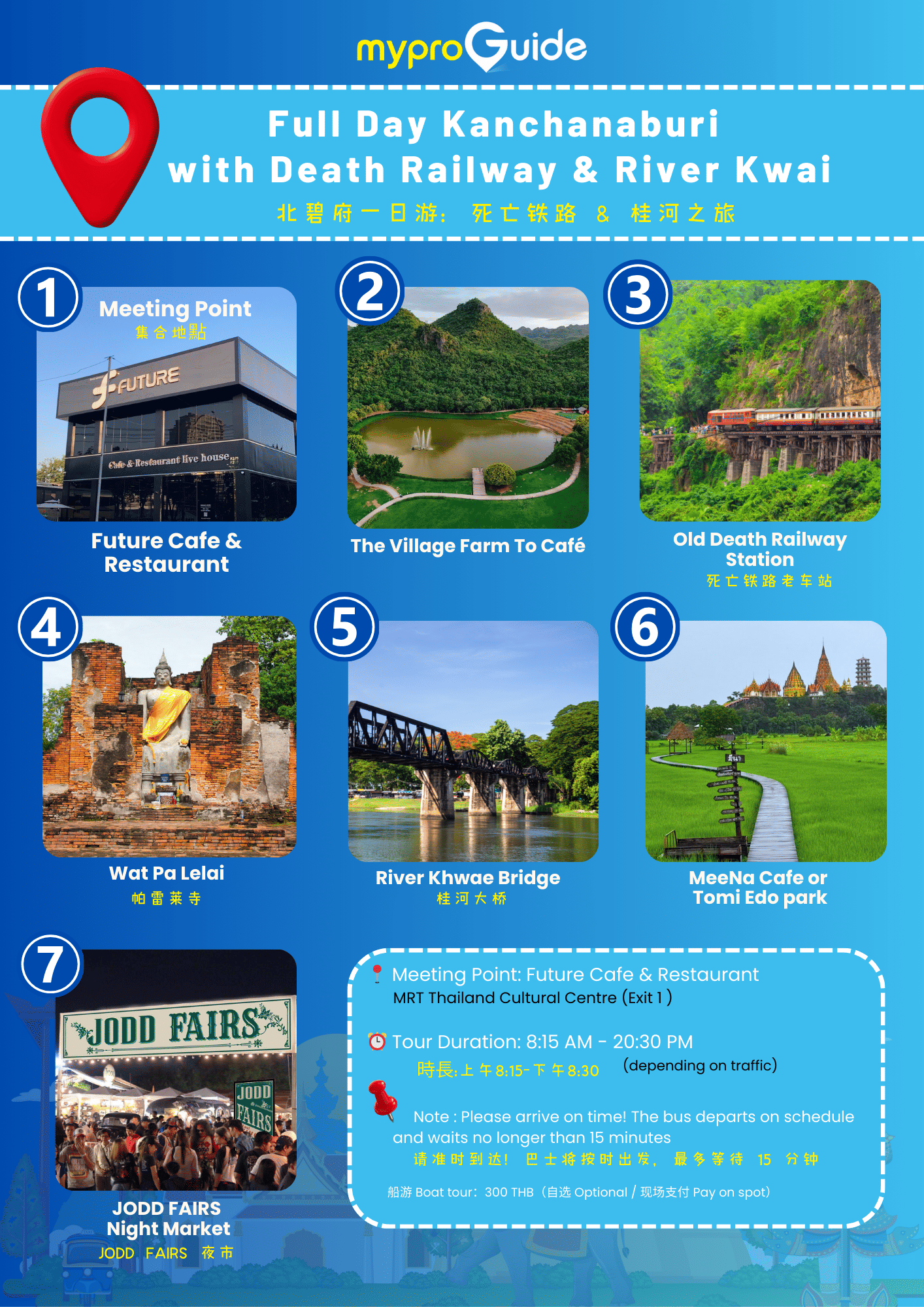 - optional Train ride on the original railway and a boat trip down the River Kwai